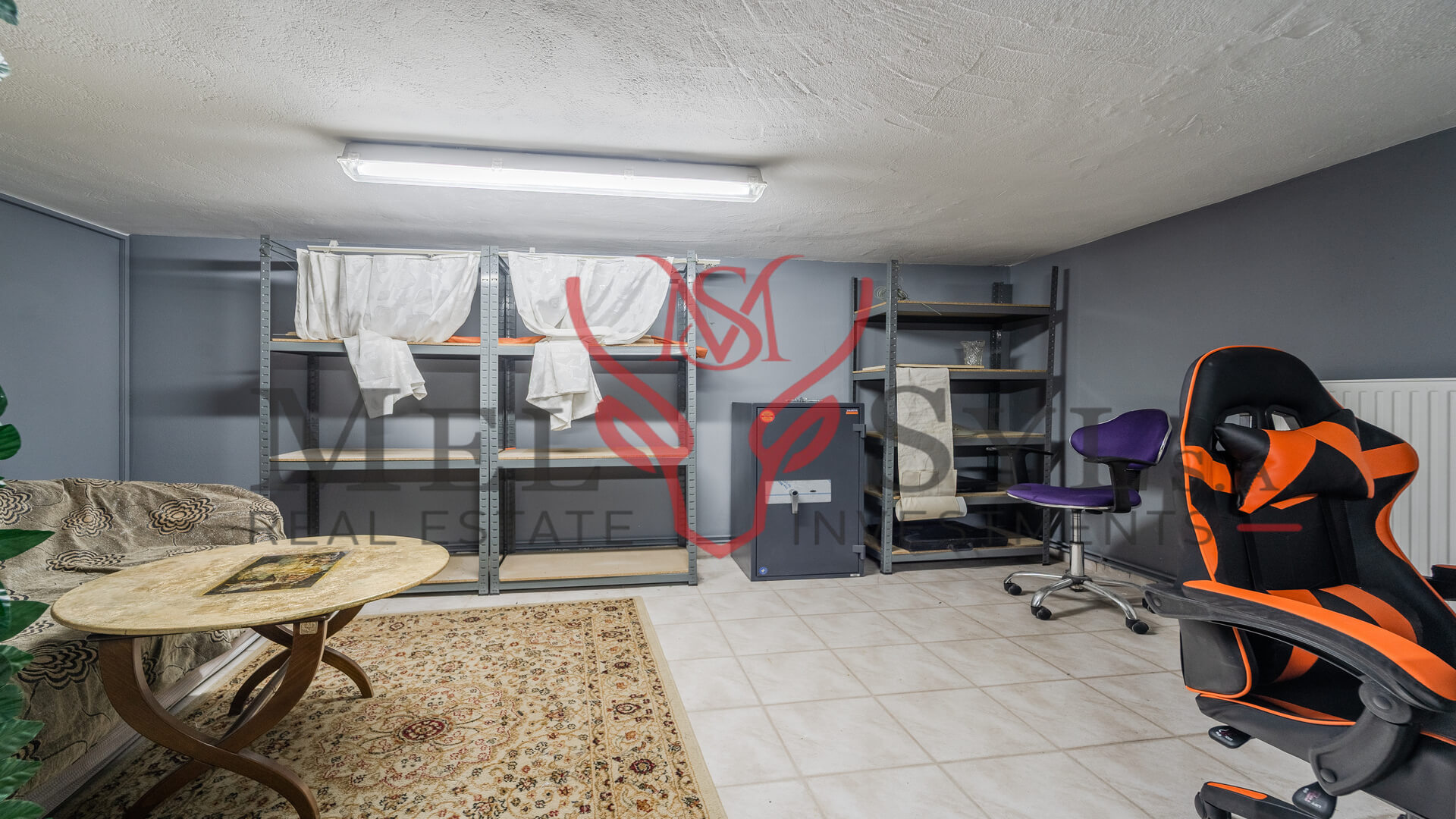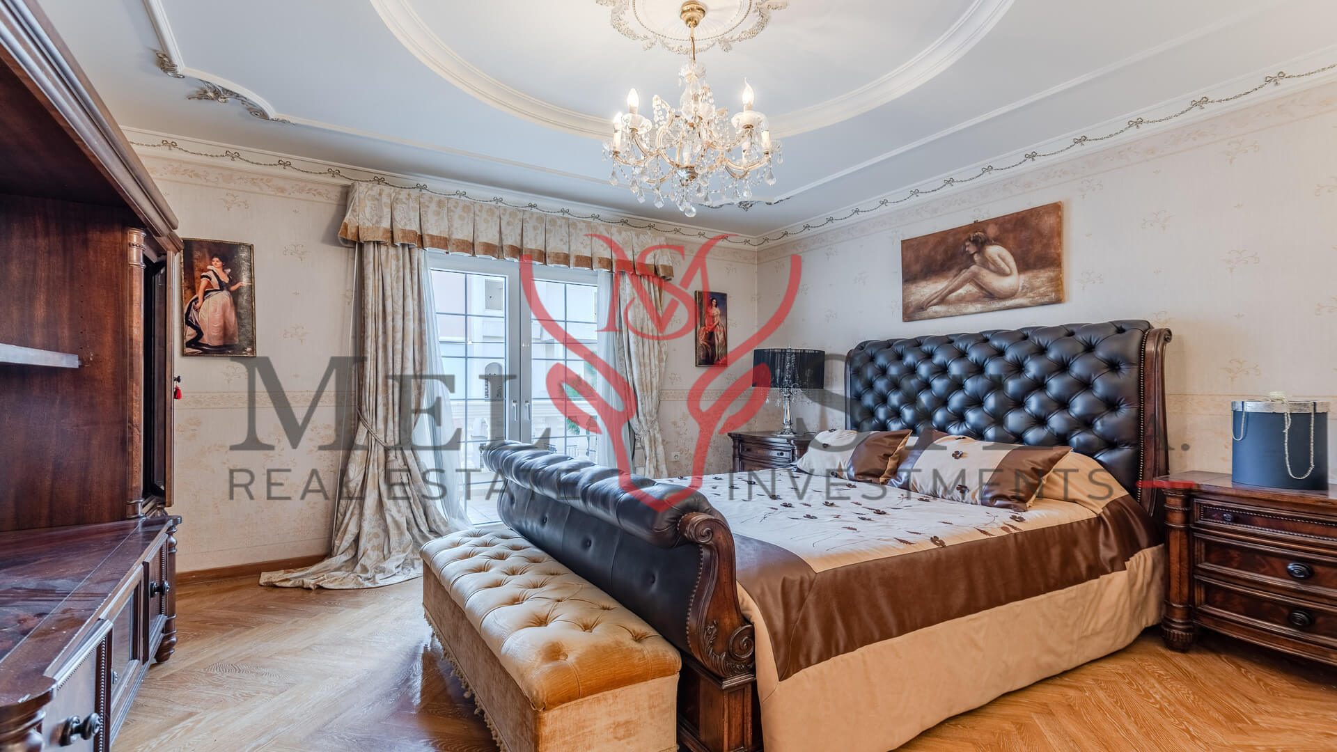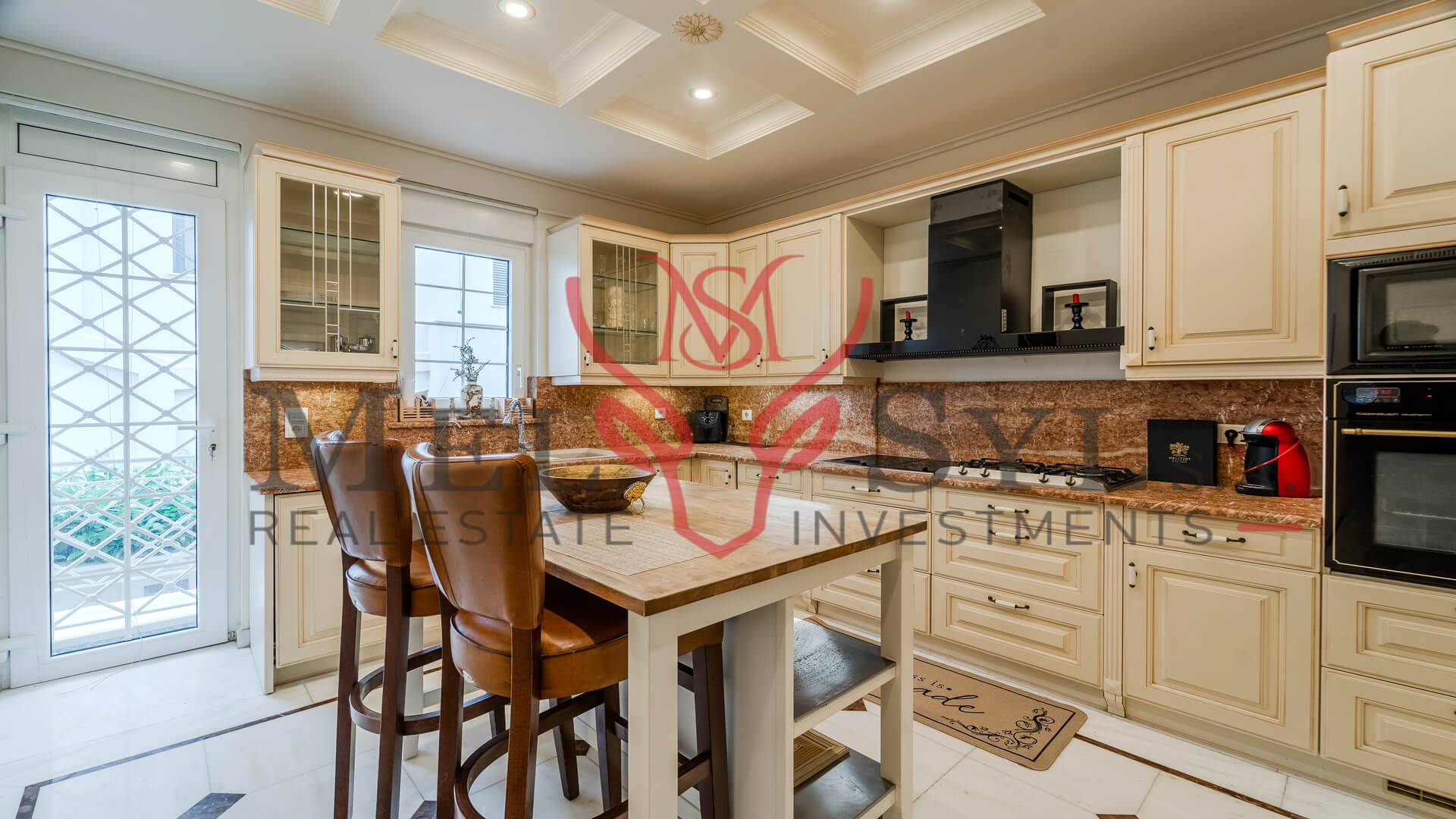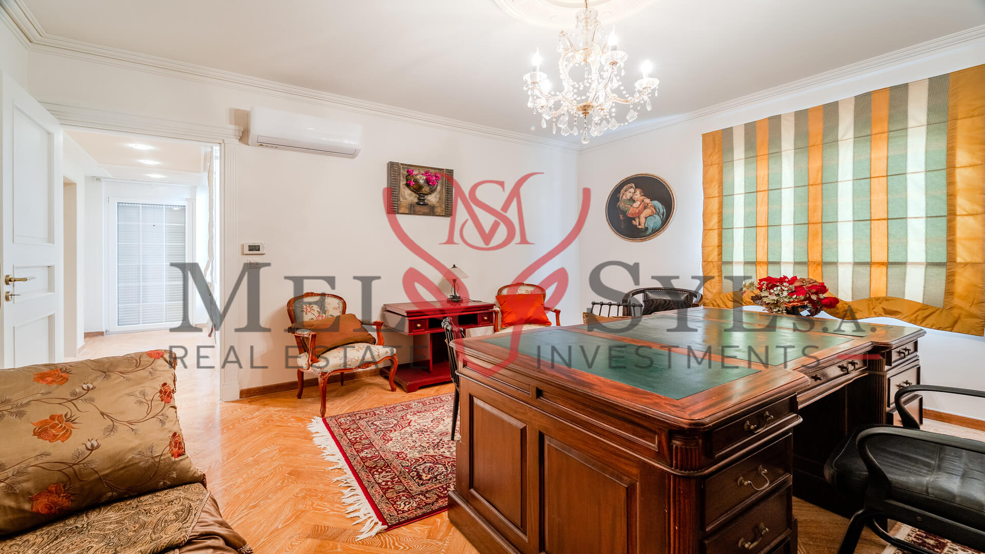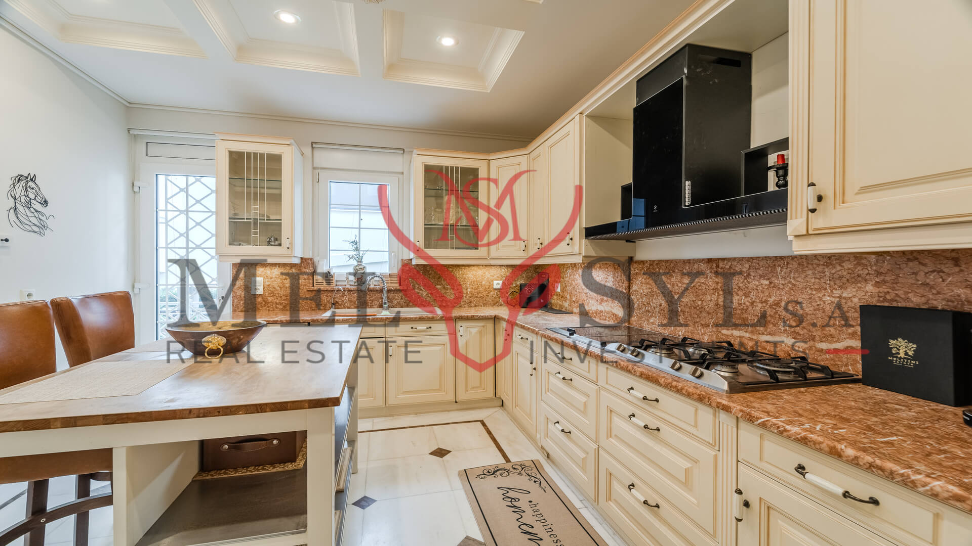 The furnishings have been curated with impeccable taste, featuring exclusive pieces from renowned Greek and international designers such as Kourtis, Varagis, as well as the American houses Brownhills and Tomasville. Built-in elements, including libraries and cabinetry, are crafted from solid oak with delicate decapé finishes and detailed artisanal flourishes. The flooring on the ground level is made of white Dionysos marble with artistic patterns, while the upper levels are fitted with elegant oak wood floors in a decapé finish. Ceilings are adorned with Venetian stucco, patinas, and hand-painted gold accents, while the central atrium is crowned by a 9-meter-high handcrafted stained-glass dome, casting a warm, ambient glow and forming a stunning architectural centerpiece. The lighting design is both artistic and functional: