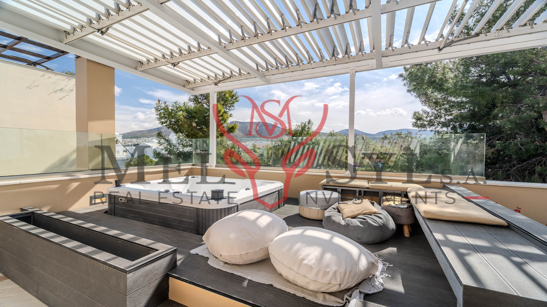 The 60 sq.m. rooftop terrace is a private oasis, featuring a jacuzzi, fully equipped bar, and an automated pergola that opens or closes depending on your mood and the weather. A panoramic setting ideal for relaxation and entertaining. This residence not only captivates with its aesthetic, but also stands out for its technical excellence: